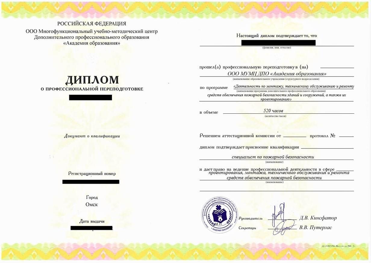 «Специалист по пожарной безопасности» с правом ведения профессиональной деятельности в сфере проектирования, монтажа, технического обслуживания и ремонта средств обеспечения пожарной безопасности